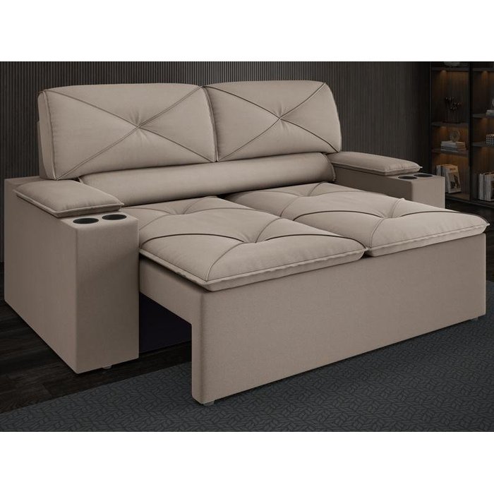 É na sala de estar onde a maior parte dos momentos de lazer da família acontece. Seja curtindo um filminho, jogando aquele lançamento dos games ou recebendo amigos para um café, por isso é essencial ter um sofá para acomodar todos bem. Espaçoso, bem estruturado e com um design para deixar o lar-style perfeito, o modelo POP tem assento retrátil com porta copos nos braços, o que faz dele uma peça ótima para oferecer aquele aconchego extra. Revestido velosuede, sendo ideal para te inspirar e dar aquela mãozinha na hora de criar o ambiente dos sonhos. Informações técnicas:Material da estrutura: Madeira Maciça de Eucalipto 100% de reflorestamento, produto ecologicamente correto.Enchimento do Assento: Espuma D-28, Percinta Elástica.Enchimento do Encosto: Percinta Elástica, Flocos de Espuma e Fibra de Poliéster Siliconada.Fixação da Estrutura: Grampos galvanizados antiferrugem.Revestimento / Tecido: Velosuede.Chaise: Não Possui. Medidas:Altura aproximada: 100cm (fechado) e 86cm (aberto).Largura aproximada: 154cm.Profundidade aproximada: 87cm (fechado), 138cm (aberto)Peso aproximado: 43,10kg.Necessita Montagem: Sim.Necessita Montador Especializado: Não. A montagem do produto pode ser feita facilmente seguindo o manual de instruções que acompanha a embalagem do produto. Não é necessário técnico especializado.Capacidade em KG por Lugar: Aproximadamente 100kg Porta Copos: Sofá possui quatro porta copos fixos (dois em cada braço). As dimensões do porta copo são aproximadamente 10cm x 5cmGarantia: 90 dias contra defeito de fabricação. *a contar da data do recebimento da mercadoria.Limpeza: Aspirar o Produto para eliminar a poeira, utilizar um pano levemente umedecido com água e sabão neutro, seguido de pano seco. Não limpar com escovas ou produtos abrasivos.Recomendações de Manutenção: Usar em local seco, não molhar. Evitar exposição ao sol, para que o produto não sofra alterações na cor. ATENÇÃO!A tonalidade do produto pode sofrer variações entre a imagem de exibição e o item físico. Imagens meramente ilustrativas.Não nos responsabilizamos pela montagem/instalação dos produtos.Os objetos que ambientam as fotos não acompanham o produto.Verifique as dimensões do produto e certifique-se que o percurso que ele fará até o local de uso permite sua passagem. Nós não nos responsabilizamos por transporte de produtos, caso não caibam em elevadores, acima de três lances de escada e não cabendo na passagem das escadas, por içamentos ou desmontagens de produtos. Quaisquer despesas deste tipo ficam a cargo do cliente.Reservamo-nos o direito de possíveis erros de digitação. Anúncio sujeito a alteração sem aviso prévio.Antes da entrega, nossos produtos passam por um rigoroso controle de qualidade para que cheguem até o cliente em perfeitas condições, entretanto, em casos de desacordo com o proposto, o comprador deverá contatar o nosso SAC e/ou a loja aonde a compra foi efetuada.Sofá com Porta Copos. Possuem porta copos fixos no braço. As dimensões do porta copo são aproximadamente 10cm x 5cmO prazo para solucionar os problemas identificados é de até 30 dias úteis, contados a partir da data do posicionamento do SAC com o comprador.