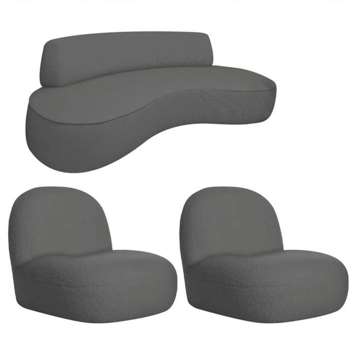 Sofá Curvo 130cm 2 Lugares e 2 Poltronas Orgânico Escritório Recepção Sala Amsterdã Linho Cinza Escu Cinza Escuro