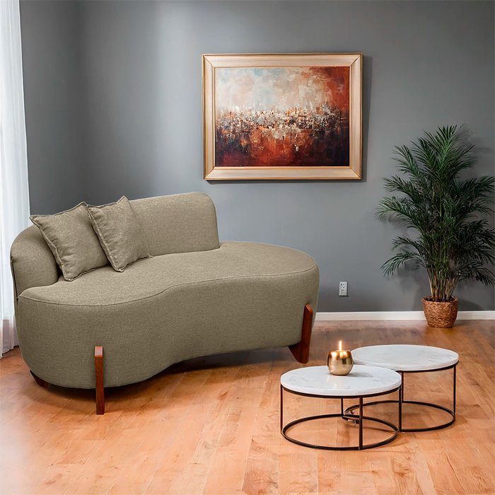 Sofá Curvo Pé de Madeira 2 Lugares Feijão Forma Orgânica Linho