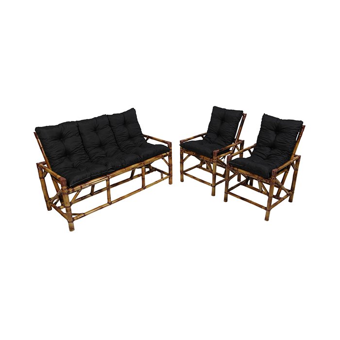 O Jogo de Bambu produzido através de matéria prima natural, que possui leveza e design moderno com sofisticação na arquitetura, e proporciona um ótimo conforto relaxante. Devido a sua flexibilidade e facilidade de manuseio, o bambu permite a execução deste trabalho artesanal com o tratamento e aplicação de verniz, garantindo mais brilho e durabilidade à peça, servindo de utensílio funcional e decorativo. Produto de alta qualidade e direto da fábrica.Conteúdo:- 01 sofá de 03 lugares: acompanha almofadas de assento e encosto;- 02 poltronas: acompanham almofadas de assento e encosto;Medidas:- Sofá: 95cm de altura x 144cm de largura x 71cm de profundidade;- Poltrona: 95cm de altura x 58cm de largura x 71cm de profundidade;Material:- Produto em bambu tratado e envernizado, com acabamento em fibra sintética e tecido lavável, fabricação 100% (cem por cento) artesanal, as medidas podem haver uma variação de 1 (um) até 2 (dois) centímetros para mais ou para menos.Garantia:- 03 meses contra defeito de fabricação.Atenção:- Confira as dimensões do produto e certifique-se de que estão adequadas aos elevadores, portas e corredores do local de entrega, pois não fazemos a montagem, desmontagem do produto e/ou portas e janelas, transporte pela escada/elevadores ou içamento pelo lado de fora do prédio. As entregas em prédios ou locais com mais de 1 (um) andar, é feita na portaria/térreo, ficando por conta do cliente o transporte até seu apartamento.
