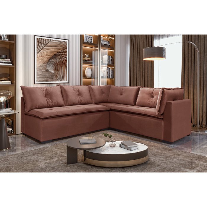 Sofá de Canto 6 Lugares 238x220cm Veludo Jundiaí Marrom Cobre
