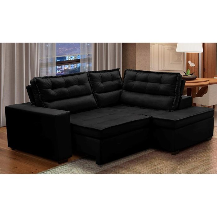 Sofá de Canto Retrátil e Reclinável com Molas 2,50x2,00 Virginia Suede Preto Adonai Estofados