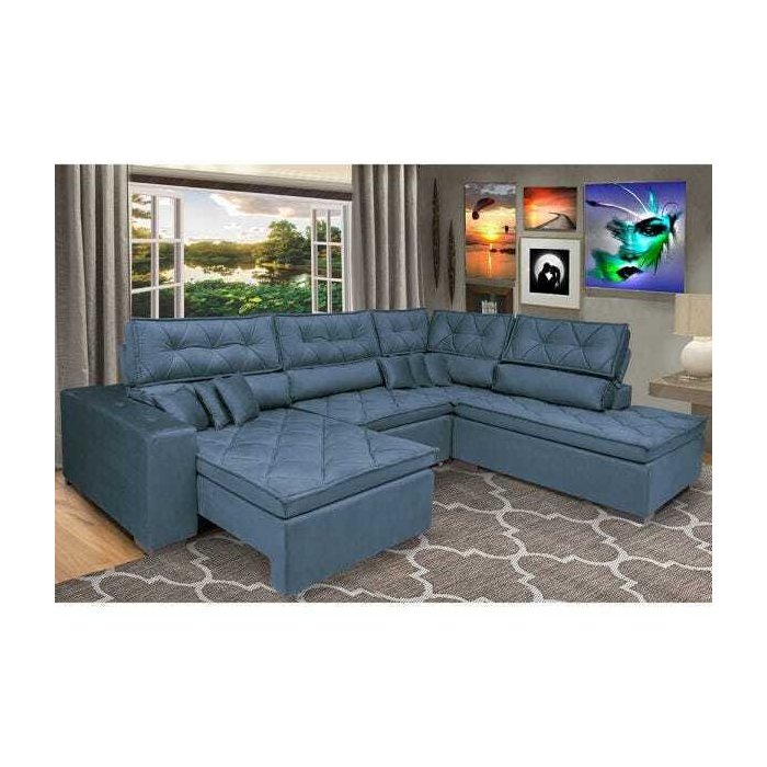 Sofá de Canto Retrátil e Reclinável com Molas Cama Inbox Platinum 3.00M x 2.36M Tecido Suede Azul