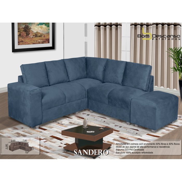 Sofá de Canto Sandero 5 Lugares e Puff Bom Descanso Veludinho Cinza