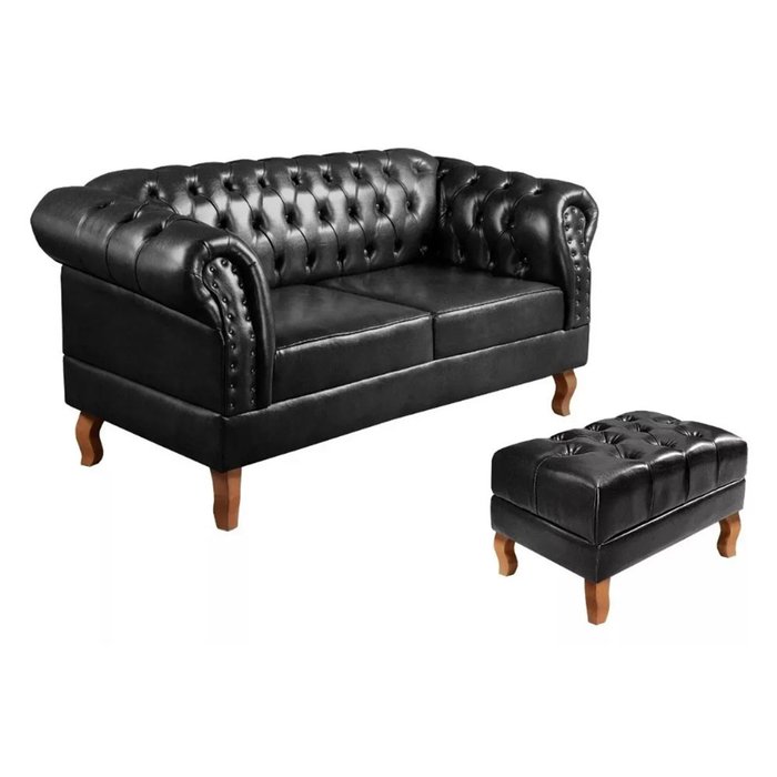 Sofá Dom Pedro Chesterfield 2 Lugares e Puff Captonê Couríssimo Bella Decor Preto