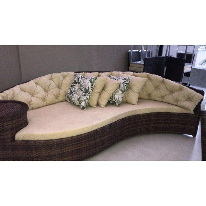 Sofá Em Fibra Sintética Peixe - Tecido Duna Deserto A estrutura de alumínio envolto em fibra sintética garante a qualidade de nossos produtos. Nossas almofadas são revestidas com tecidos Acquablock, compostos por 72% algodão e 28% poliéster, com acabamento impermeável. Confira os tecidos disponíveis e todas as vantagens Acquablock aqui. Dimensões A80 x L280 x C100 cm Por se tratar de confecção artesanal, as dimensões dos produtos podem sofrer variação. Cuidados na manutenção do seu móvel Material de fibra sintética é ideal para utilização em ambientes externos, necessitando apenas de pequenos cuidados para que seu móvel mantenha sua aparência como novo. O ideal é limpar as peças semanalmente, usando uma escova com cerdas macias molhada em uma mistura de água com sabão neutro ou pano úmido. Na sequência, deixe os móveis secarem naturalmente à sombra. Durante a higienização de sintéticos, respeite também o sentido das fibras e nunca aplique força demasiada para não comprometer a superfície do trançado.Nunca utilizar lavadoras de pressão sobre as fibras. As almofadas de assento e encosto são em tecido impermeável, que bloqueia líquidos, poeiras e fungos, não sendo aconselhável a permanência de estofados em ambiente externo, expostos a intempéries climáticas (chuva). Garantia Este móvel tem garantia de quatro (04) meses, se usado em condições normais, contra defeitos de fabricação. Essa garantia não cobre defeitos causados por uso inadequado ou abusivo, falta de cuidados, desbotamento natural dos tecidos ou riscos decorrentes do uso.