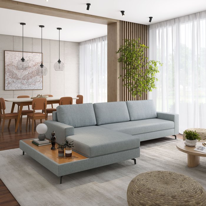 Sofá em Linho 292cm Chaise Esquerdo e Deck Loft