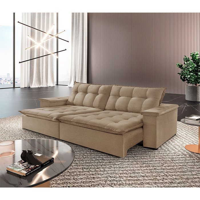 Assento: Retrátil com Percinta elástica, molas espirais, espuma D-28 soffet com metalasse, pillow top de 10 cm.