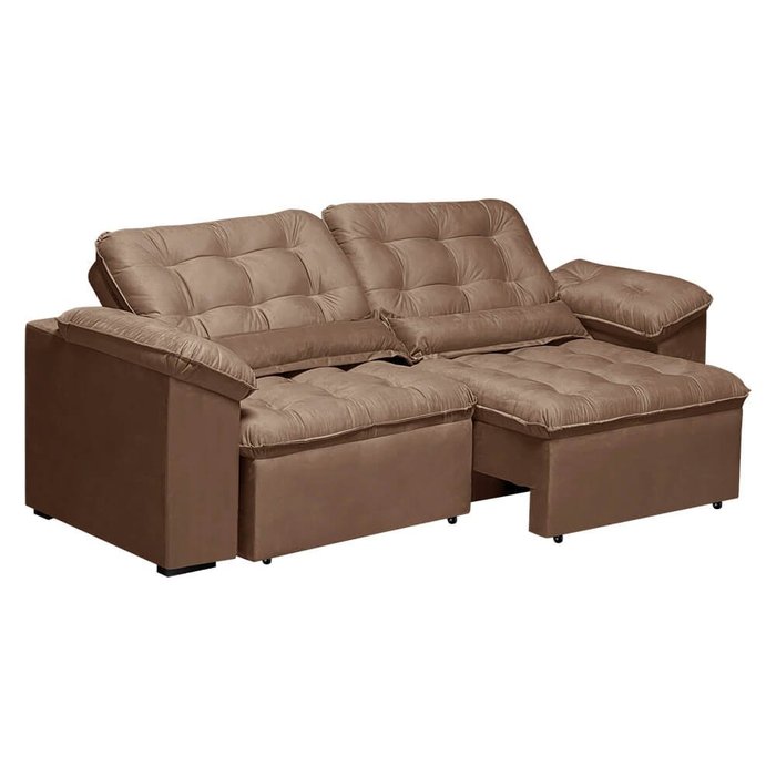 Características TécnicasAltura 102cm Largura 230cm Profundidade 90cm(Fechado); 130cm(Aberto) Material da estrutura Madeira pinus Acabamento Tecido Revestimento Suede aveludado Tipo de encosto Reclinável  Enchimento do encosto Fibra siliconada Tipo de assento Retrátil Enchimento do assento Fibra siliconada Sustentação assento e encosto Percinta elastica e mola espiral Peso suportado Até 220kg Recomendações de limpeza e manutenção Pano umedecido em água, utilizar aspirador em baixa rotação Garantia do produto 3 meses contra defeito de fabricação
