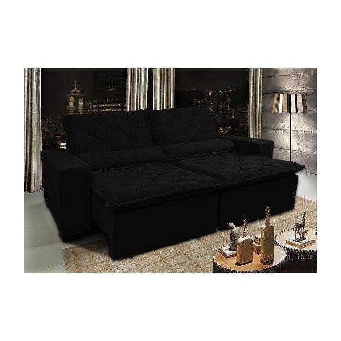 Sofá Lisboa 2,72M Retrátil e Reclinável, Molas No Assento Tecido Suede Velusoft Preto Cama Inbox