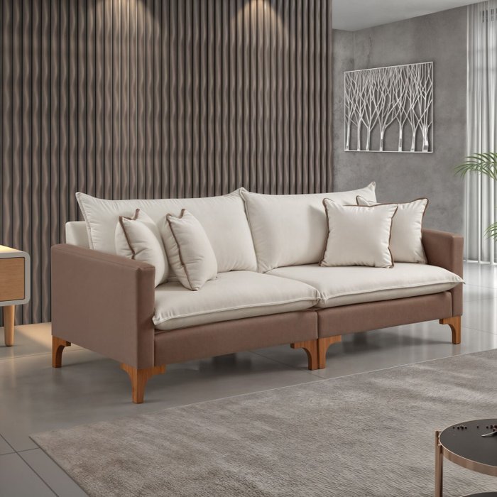 Sofá Living Bipartido com 4 Almofadas 240cm Bouclé Espanha Bege Claro/Marrom