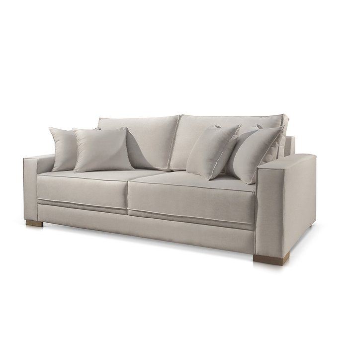 Estrutura em eucalipto tratado anti cupim.Assento em molas espirais, percintas elásticas, espuma D28 soft (qualidade contínua 10cm espessura).Encosto almofadas soltas com fibra siliconizada.Pé em madeira.