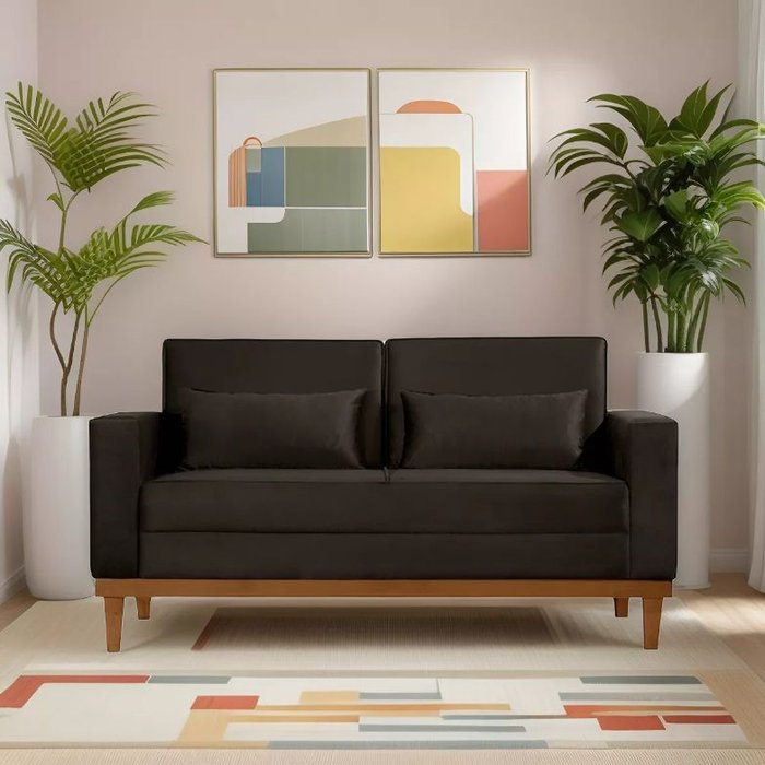 Sofá Living Valência 1,58 Mts C/ Base Madeira Veludo Marrom C/ 2 Almofadas -d28
