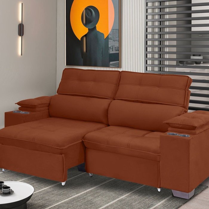 Sofá Retrátil e Reclinável Manaus. Com uma estrutura interna resistente, ele possui a estabilidade necessária para esse tipo de móvel, tendo o enchimento das almofadas em fibra siliconada, percintas elásticas italianas e molas bonnel, dão o suporte necessário para o conforto, sendo perfeito para acomodar você e as pessoas que ama naquela maratona de séries, ou até mesmo para descansarem aos finais de semana. Dê um up no visual da sua casa. Demais, né? Garanta já o seu!