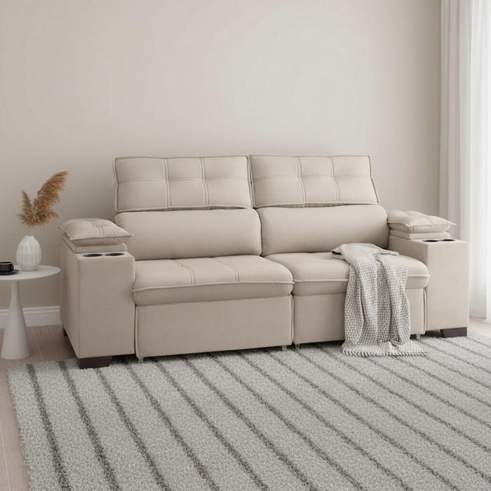 Sofá Retrátil e Reclinável Manaus. Com uma estrutura interna resistente, ele possui a estabilidade necessária para esse tipo de móvel, tendo o enchimento das almofadas em fibra siliconada, percintas elásticas italianas e molas bonnel, dão o suporte necessário para o conforto, sendo perfeito para acomodar você e as pessoas que ama naquela maratona de séries, ou até mesmo para descansarem aos finais de semana. Dê um up no visual da sua casa. Demais, né? Garanta já o seu!