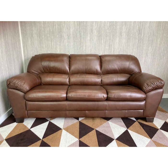 Revestimento 100% em couro Marrom Escuro. Assentos fixos produzidos em espuma de poliuretano em densidade 28 com percintas elásticas e molas nozag em aço. Encostos fixos produzidos em fibra de poliéster siliconizada e espuma de poliuretano com molas nozag em aço. Estrutura em madeira de reflorestamento Pés em MDF madeirado na cor imbuia.