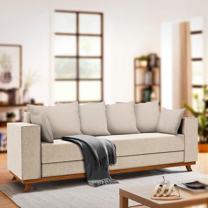 Sofá Moderno Pés Em Madeira Maciça 4 Lugares Linho Bege Muniz Cromos