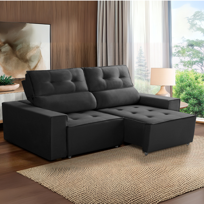 Assento: Retrátil, ideal para transformar o sofá em um verdadeiro espaço de descanso.