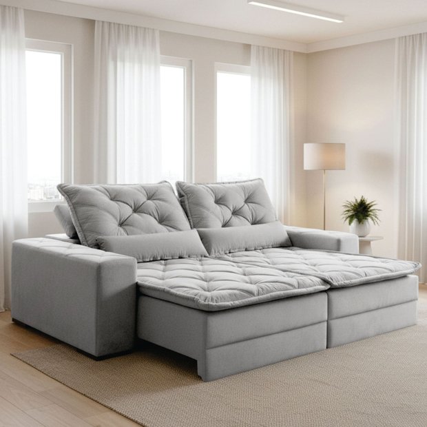 O descanso que você merece está aqui: um sofá retrátil e reclinável em até 5 estágios, pensado para oferecer conforto em qualquer posição. O assento D-28 com molas espirais garante firmeza, durabilidade e aconchego, enquanto os rodízios de silicone facilitam a abertura com leveza. Ele vem acompanhado de 2 rinheiras 100% fibras de silicone, que trazem maciez extra para seus momentos de relax. A base e os pés em madeira maciça unem resistência e elegância, além de serem ecologicamente corretos. E por ser em módulos com engate união, a montagem é rápida e prática, adaptando-se facilmente ao seu espaço. Um sofá completo para transformar sua sala em puro bem-estar. O que significa o sofá ter 5 estágios de reclínio? Permite ajustar o encosto em até 5 posições, garantindo mais conforto.
