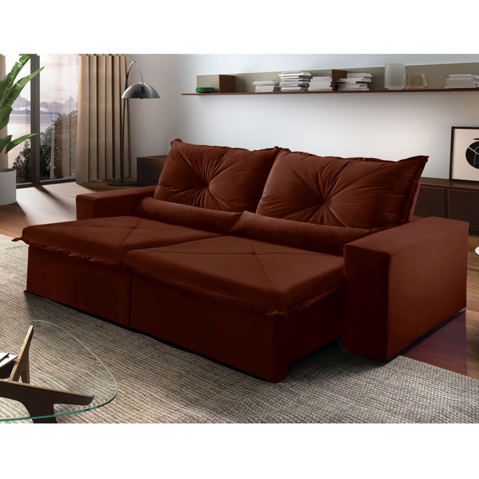 Possui também possui mecanismo retrátil em aço que permite abertura do sofá para sua maior comodidade. O revestimento em tecido com manta acrílica recebe costura com pesponto duplo, feito com máquinas de ponto eletrônico, proporciona beleza nos desenhos captonê e resistência da costura.