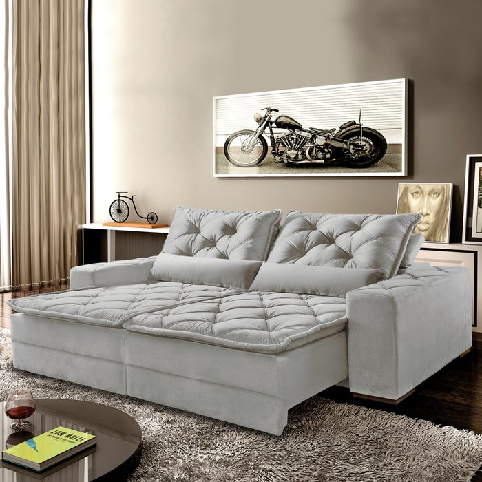 O assento de pillow com espuma elástica D28 certificada, a base do assento com molas espirais e percinta elástica de alta resistência. Possui também mecanismo retrátil em aço que permite abertura do sofá para sua maior comodidade.