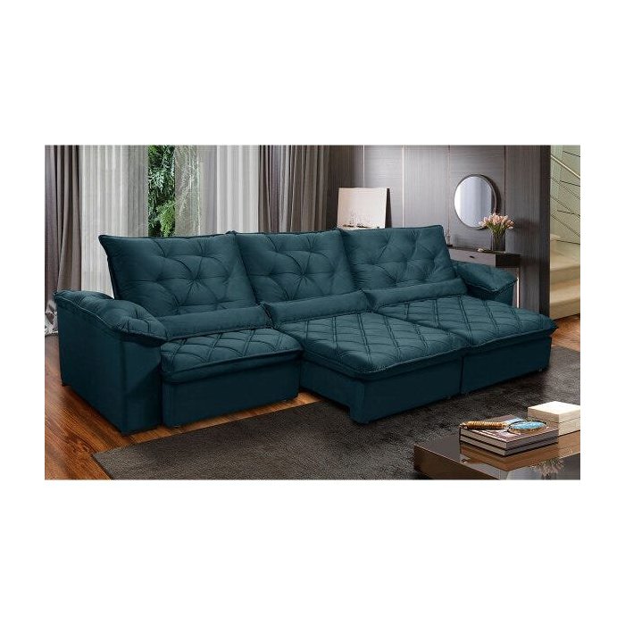 Sofá Retrátil 410 Cm 8 Lugares Duplo Molejo Pillow D28 Portinari Veludo Azul - Grandellar