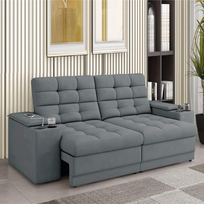 Sofá Retrátil E Reclinável 2,05m 3 Lugares Com Porta Copos Kansas Veludo Luizzi Cinza