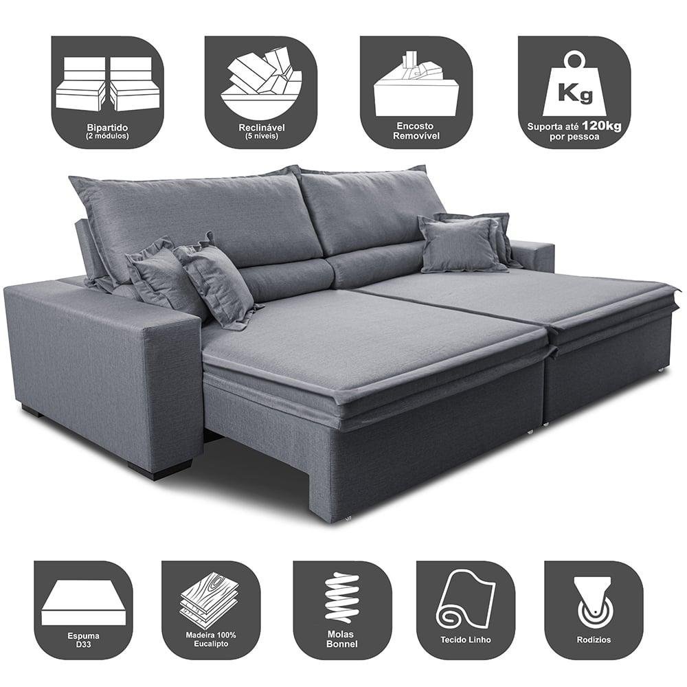 Sofá Retrátil e Reclinável 2,55m Império com Molas Cama inBox Linho Cinza Escuro Cinza Escuro