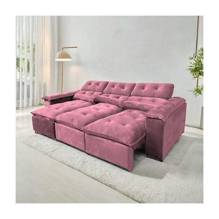 Sofá Retrátil e Reclinável 2,75m em Tecido Veludo C/ Pillow Nos Braços - Montagem Inclusa:rosa