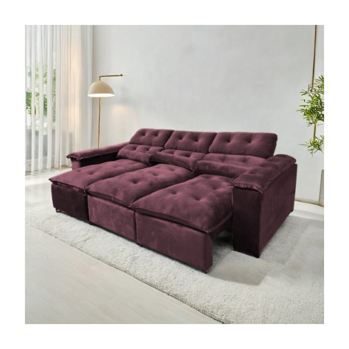 Sofá Retrátil e Reclinável 2,75m em Tecido Veludo C/ Pillow Nos Braços - Montagem Inclusa:vinho Vinho