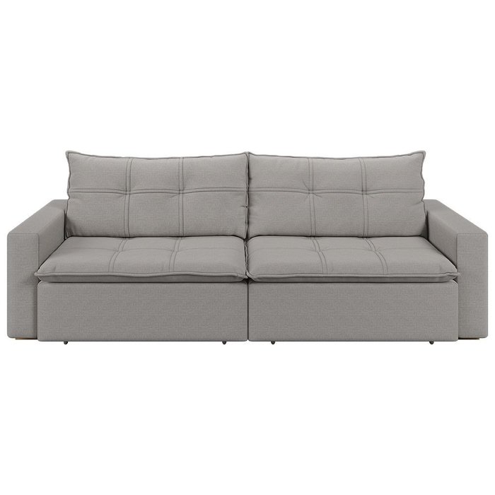 Material: O sofá possui estrutura em madeira de eucalipto reflorestada, assento retrátil com mecanismo metalico, espuma contínua D28 Supersoft sustentado por 4 molas de aço espirais e percinta sintética, encosto fixo com catraca em 3 estágios, almofadas com enchimento em fibra de silicone. O revestimento é em linho 100% poliéster, os módulos retráteis contam com rodinhas de silicone, os pés são de madeira e o acabamento é em costura prespontada com puxões no assento, unindo conforto, resistência e elegância.