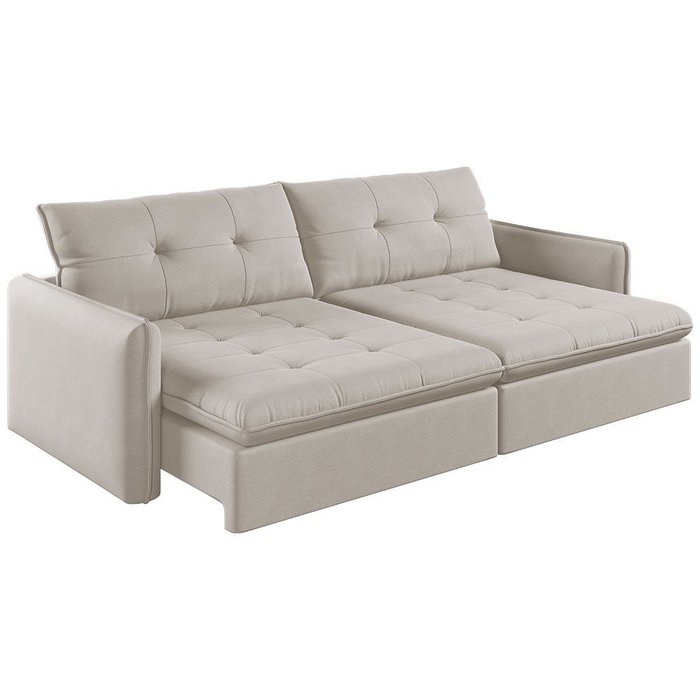 Material: O sofá possui estrutura em madeira de reflorestamento, assento retrátil com mecanismo metalico, pillow nos assentos com 16cm de espuma contínua D28 Supersoft sustentado por 4 molas de aço, encosto reclinável em 3 posições, almofadas soltas com enchimento em fibra de silicone. O revestimento é em linho 100% poliéster, os módulos retráteis contam com rodinhas de silicone, os pés são de madeira, unindo conforto, resistência e elegância.