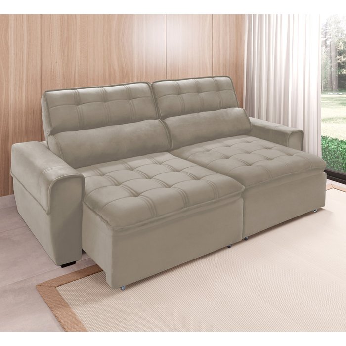 Agora deixar sua casa moderna e confortável ficou muito mais fácil, graças ao estofado Malibu.Possui estrutura em madeira de lei (Eucalipto) devidamente tratada e aparelhada, com reforços, cantoneiras e chapas em MDF.Produzido com percintas elásticas no encosto e no assento para maior resistência e durabilidade.Seu encosto é reclinável, composto por fibras siliconadas mistas com flocos de espuma.Seus braços são compostos com espuma D-20 e removíveis.O assento é retrátil, composto por Espuma D-26 soft, molas espirais no assento e rodízios de cristal.O acabamento é em TNT preto para forração interna e pés em madeira.MEDIDAS- Altura: 100 cm | Largura: 210 cm | Profundidade fechado: 106 cm | Profundidade aberto: 155 cmMATERIAIS- Material da estrutura: Madeira de lei (Eucalipto) tratada, MDF- Revestimento: Suede- Assentos: Espuma D-26 soft e molas espirais- Encosto: Fibras siliconadas mistas e flocos de espuma- Braços: Espuma D-20LIMPEZA- Limpar com flanela ou pano macio seco, não utilizar produtos abrasivos, desengordurantes, álcool ou solvente.- Limpeza diária com flanela seca para remoção do pó.- Nunca utilizar materiais abrasivos como esponja sintética, esponja de aço, saponáceos.- Secar rapidamente qualquer líquido.INFORMAÇÕES ADICIONAISGarantia de 3 meses.As imagens são ilustrativas, não acompanham objetos de decoração e eletrônicos.Pode haver alguma diferença de tonalidade entre a imagem e o produto real, por conta do tratamento de imagens e a calibração de cores do seu monitor.A montagem será de responsabilidade do comprador, não nos responsabilizamos, no ato da entrega, por subir escadas/elevadores ou transporte por guincho em apartamentos.Eventuais despesas são de responsabilidade do comprador.Confira as dimensões deste produto e certifique-se de que passará normalmente por supostos elevadores, portas, escadas e/ou corredores de sua residência.Ao receber a mercadoria, o cliente deve verificar as condições da embalagem, caso haja alguma avaria não assine o comprovante de recebimento.