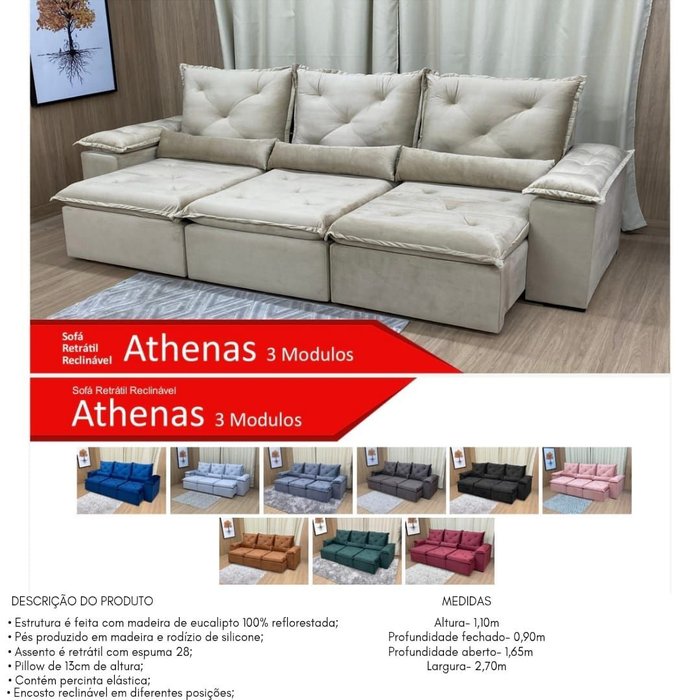 Sofá Retrátil Reclinável Athenas 3 módulos – Conforto e Sofisticação para Sua Casa