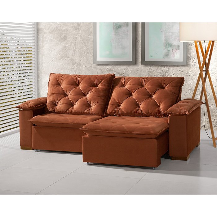 Sofa Retrátil Reclinável Milão 2,90 5 Lugares Estofado Capitonê C/ Braço Almofadado Veludo Terracota LARANJA