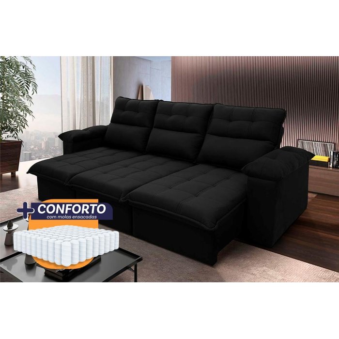 Sofá Retrátil Reclinável Verona 2,30m Suede Velut Molas Ensacadas - King House Preto