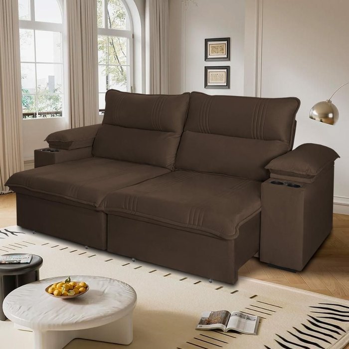 Sofá Retrátil Tesla 3,10m Usb e Porta Copo Suede Marrom