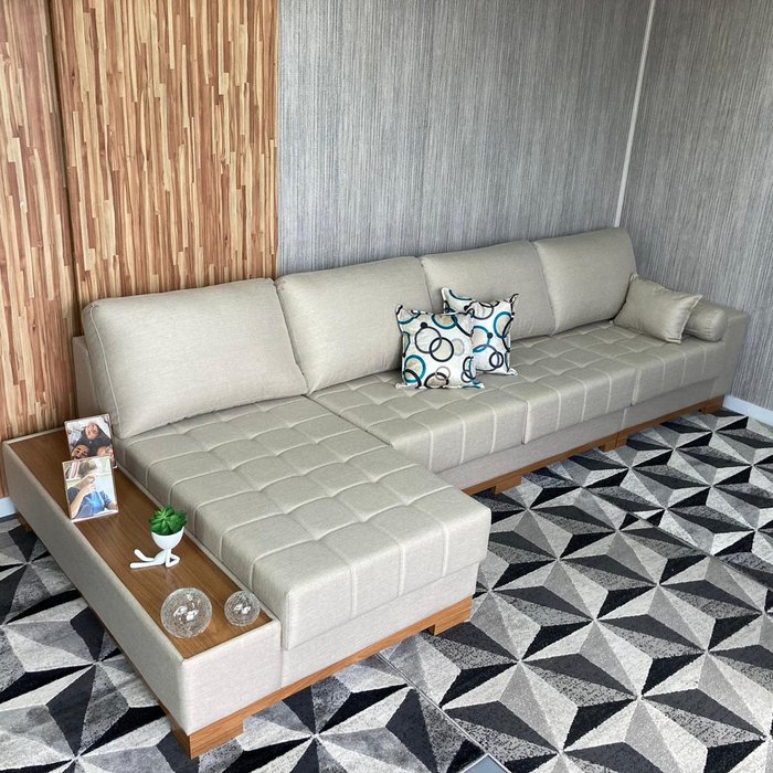 Três (3) assentos retráteis e 1 chaise longue fixa com mesinha acoplada na cor champanhe. Revestimento em linho bege rustick 55 e produzidos em espuma de poliuretano em densidade 28 com percintas elásticas. Encostos fixos produzidos com espuma de poliuretano densidade 28 e fibra de poliéster. Estrutura produzida em madeira de reflorestamento e base em MDF cor champanhe.
