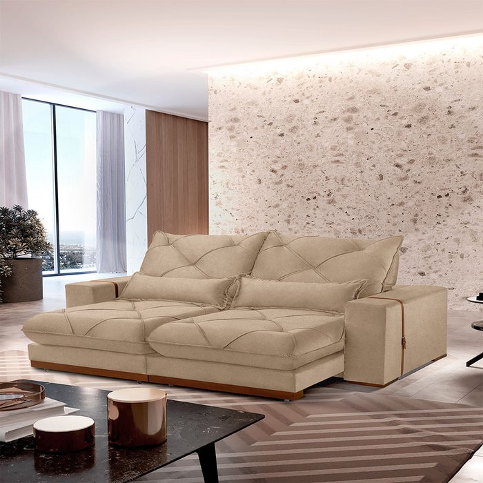 Assento: Retrátil com Percinta elástica, molas ensacadas e molas espirais, espuma D-28, pillow de 25 cm.