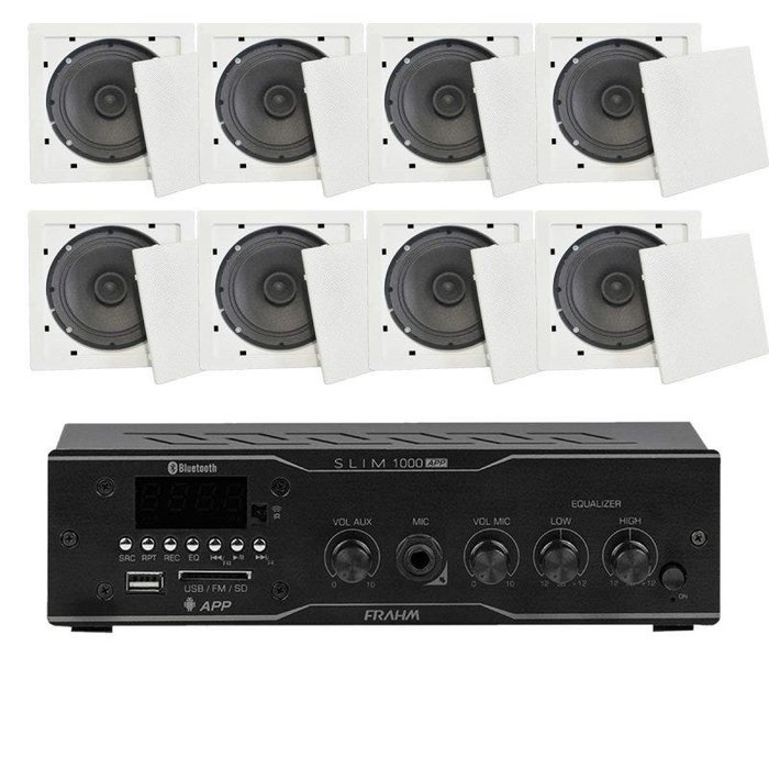 SOM AMBIENTE VOXTRON KITAMB8APPFIAM | 40W | 8 CAIXAS de TETO MODELO: KITAMB8APPFIAM O KITAMB8APPFIAM produz os mesmos níveis sonoros em qualquer parte do ambiente. Especificações Gerais e Técnicas dos Produtos: 2203 R - Diâmetro do alto-falante: 6 polegadas; - Resposta de frequência: 70Hz - 18kHz (-10dBs); - Sensibilidade: 87dB / w / m; - Impedância: 8 Ohms; - Frequência de ressonância: 99 Hz. Potência - Programa musical: 60 Watts; - RMS (NBR 10303): 30 Watts. Slim 1000 APP - Potência: 40W; - Entradas: 2 canais independentes; - Canal 1: APP, Bluetooth, USB, SD Card e FM, controle remoto com troca de pastas / Auxiliar - iPhone, iPad, iPod, tablets, celulares, MP3, CD, DVD, TV; - Canal 2: Microfone; - Saída: Line Out; - Equalizador: 2 vias (graves e agudos); - Alimentação: