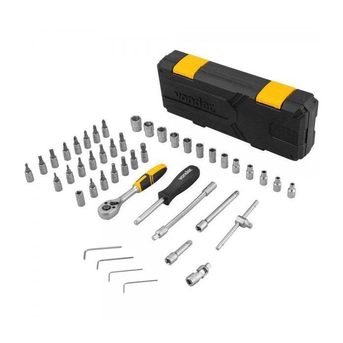 1 Jogo de soquetes e ponteiras composto por 46 peças, sendo: 13 soquetes sextavados de encaixe 1/4" (4 mm, 4,5 mm, 5 mm, 5,5 mm, 6 mm, 7 mm, 8 mm, 9 mm, 10 mm, 11 mm, 12 mm, 13 mm e 14 mm), 6 soquetes hexagonais de encaixe 1/4" (3 mm, 4 mm, 5 mm, 6 mm, 7 mm e 8 mm), 3 soquetes bits fenda encaixe 1/4" (4 mm, 5,5 mm e 6,5 mm), 3 soquetes bits phillips encaixe 1/4" (PH1, PH2 e PH3), 2 soquetes bits pozidrive encaixe 1/4" (PZ1 e PZ2), 7 soquetes bits hexalobulares encaixe 1/4" (T10, T15, T20, T25, T27, T30 e T40), 1 adaptador tipo joelho encaixe 1/4", 1 extensão flexível de encaixe 1/4" (150 mm), 1 adaptador para bits 1/4" x 1/4", 4 chaves allen (1,27 mm, 1,5 mm, 2 mm e 2,5 mm), 1 prolongador médio de encaixe 1/4", 1 prolongador pequeno de encaixe 1/4", 1 catraca encaixe 1/4", 1 cabo T encaixe 1/4", 1 cabo adaptador quadrado de 1/4". Acompanha maleta plástica.
