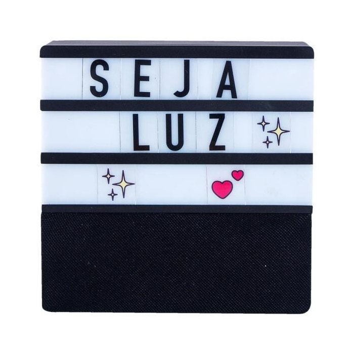 O toque de fofura e decoração que faltava na sua casa! O Speaker LED letras vem com 110 caracteres para você deixar a mensagem que quiser, além de apeaker para tocar aquela sua playlist favorita! Material: ABS, PVC e componentes eletrônicos . Contém: 1 speaker led, com 110 caracteres (com letras, números e símbolos) e um cabo USB. Cuidados: Limpar com pano seco. Não utilizar produtos abrasivos. Impactos e quedas podem danificá-lo. Isso não é um brinquedo. Mantenha longe das crianças. Manter longe de água e calor. Bateria fraca pode causar má conexão. Utilizar somente portas 5V, 500mAh para carregar. Não utilizar o produto enquanto ele estiver carregando. Como Usar: O speaker possui uma bateria interna recarregável. Antes de usar a função speaker pela primeira vez, você deve carregar a bateria completamente*! Depois disso, ligue o seu speaker empurrando o interruptor para a posição “ON”. Ele emitirá um som, e uma luz verde piscará. Depois uma luz branca se manterá constante. Ative o Bluetooth do seu dispositivo, procure por “Uatt” e conecte-se**. Ele emitirá um som. Pronto! Agora é só escolher a sua playlist favorita e curtir o som! *Para carregar a bateria, insira o conector do cabo USB na entrada “Charging” do speaker e conecte o outro lado à porta USB. Conecte somente em computadores e tomadas elétricas (bivolt), utilizando o adaptador USB do carregador de celular, 5V (não incluso). Uma luz vermelha, ao lado da porta “Charging”,acenderá durante o carregamento e desligará quando a carga estiver completa. ** Caso necessário, digite a senha “0000” para se conectar.