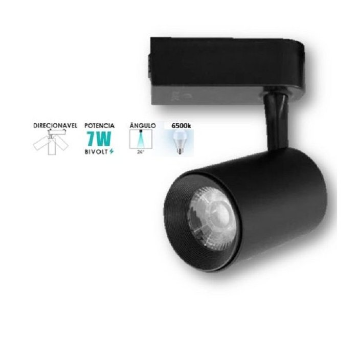 - 01 Spot Para Trilho Eletrificado Preto com Lâmpada Led de 7W Branco Frio 6500K