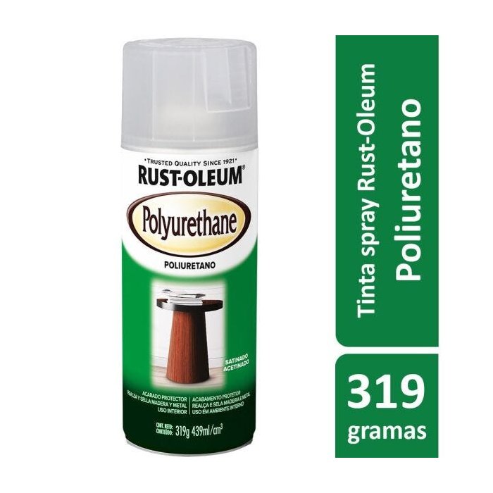 Rust-Oleum® Polyurethane é um poliuretano em aerossol que proporciona um acabamento protetor transparente que permite ver os veios da madeira, ressaltando sua beleza. Protege superfícies de madeira ou metal contra riscos, abrasão, manchas de água e produtos químicos. Oferece uma proteção duas vezes mais durável do que a obtida ao se utilizar um verniz convencional.