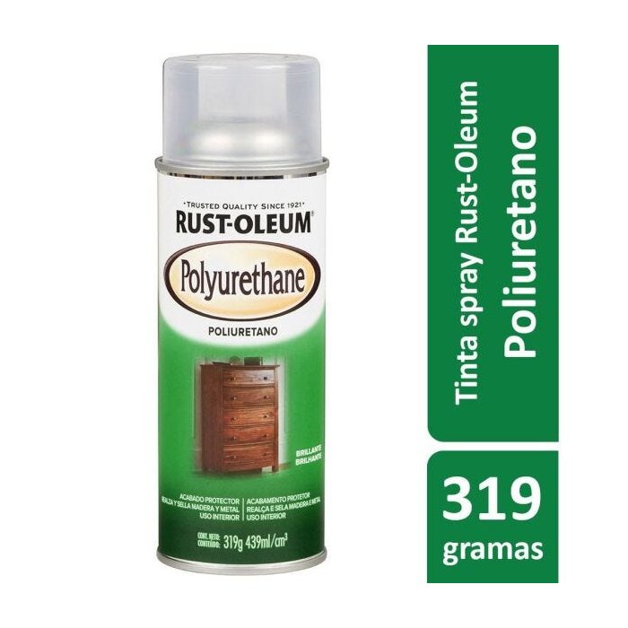 Rust-Oleum® Polyurethane é um poliuretano em aerossol que proporciona um acabamento protetor transparente que permite ver os veios da madeira, ressaltando sua beleza. Protege superfícies de madeira ou metal contra riscos, abrasão, manchas de água e produtos químicos. Oferece uma proteção duas vezes mais durável do que a obtida ao se utilizar um verniz convencional.