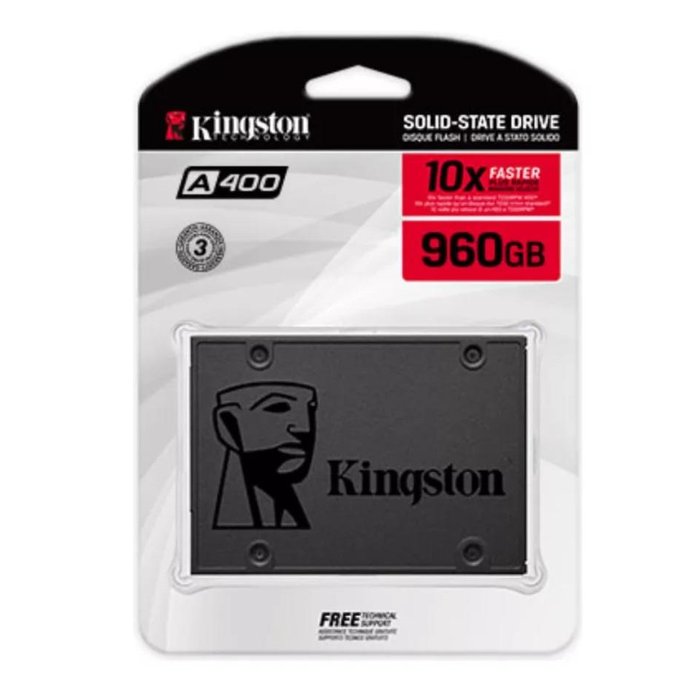 Ssd Kingston A400 960GB Sata Leitura 500MB/s Gravação 350MB/s SA400S37/960GSSD Kingston A400 é o mais confiável e durável do que um disco rígido A unidade de estado sólido A400 da Kingston aumenta drasticamente a resposta do seu computador com tempos incríveis de inicialização, carregamento e transferência, comparados a discos rígidos mecânicos.