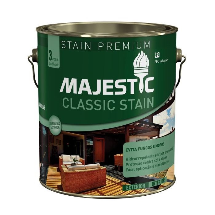 Majestic Classic Stain é um acabamento impregnante, que concede à madeira hidrorrepelência, tripla proteção UV e excelente resistência às ações do sol e da chuva. Possui ação fungicida e algicida para evitar o aparecimento de fungos e mofos e é fácil de aplicar. Classic Stain realça os veios da madeira, proporcionando um acabamento acetinado, com toque macio e sedoso. Indicado para uso em exteriores e interiores sobre diversas superfícies de madeira como: paredes, móveis, decks e pergolados.
