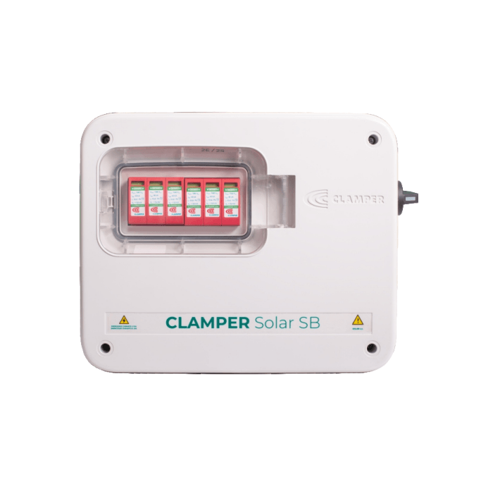 Caixa de junção (String Box), equipada com Dispositivos de Proteção contra Surtos (DPS) CLAMPER Solar, dispositivos de interrupção e