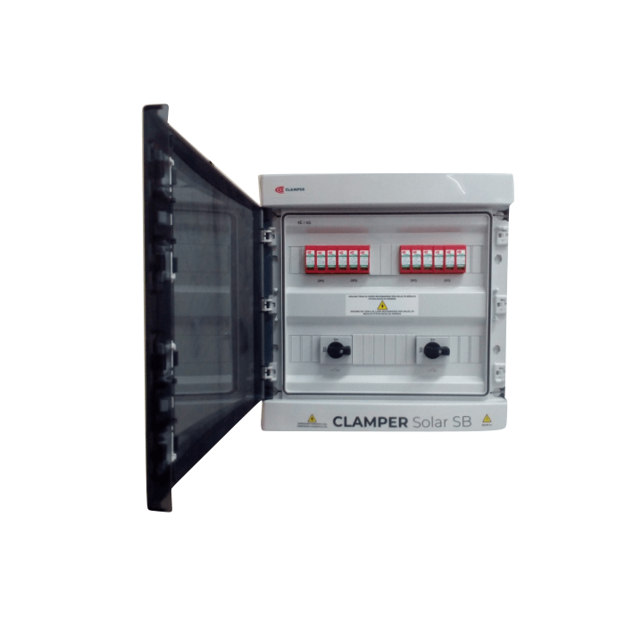 Caixa de junção (String Box), equipada com Dispositivos de Proteção contra Surtos (DPS) CLAMPER Solar, dispositivos de interrupção e