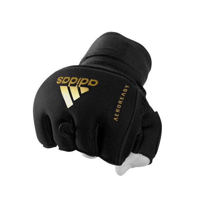 Materiais externos de neoprene e poliéster. camada interna de gel protege os metacarpos, Tecido respirável que absorve a umidade permite uma ventilação otimizada graças à tecnologia Aeroready, Costura entre os dedos, orifício para o polegar e alça para puxar o protetor, Enrole a bandagem de gancho e alça para um ajuste ideal (2 metros)
